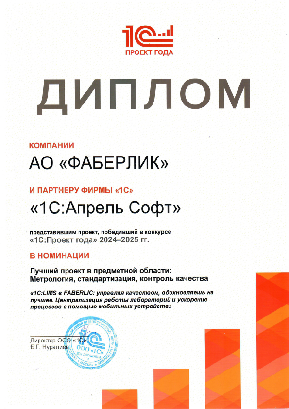 В 2025 году специалисты Департамента ERP-решений 1С:Апрель Софт завершили масштабный проект по внедрению системы 1С:LIMS в компании АО "Фаберлик". По итогам голосования он признан лучшим в предметной области "Метрология, стандартизация, контроль качества".